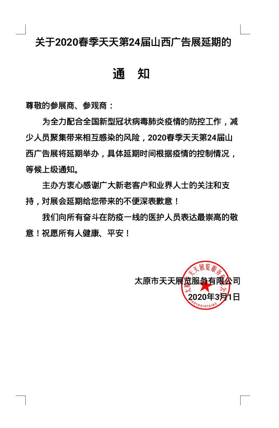 關(guān)于2020春季天天第24屆山西廣告展延期的通知
