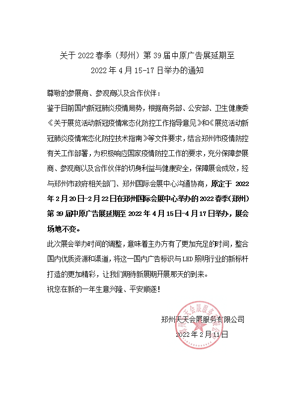 根據(jù)近期國內(nèi)新冠肺炎疫情形勢,為積極響應(yīng)國家疫情防控工作的要求,充分保障參展商、參觀商以及合作伙伴的切身利益與健康安全,鄭州天天會展服務(wù)有限公司將原定于今年2月20-22日舉辦的2022春季(鄭州)第39屆中原廣告展延期至4月15 -17日進(jìn)行,展會原定場地不變。